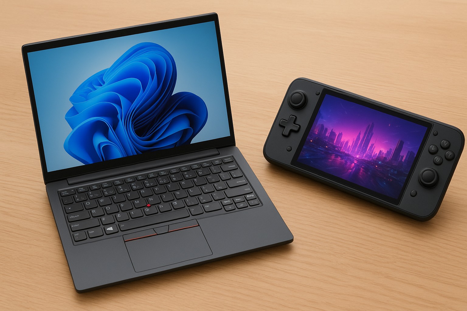 1つは、仕事道具としてのノートパソコンを「状況に合わせて構成を変えられる」方向へ押し広げること。もう1つは、携帯型ゲーム機を「持ち歩ける画面サイズの限界」から解放して、遊ぶ時だけ大画面にする設計です。